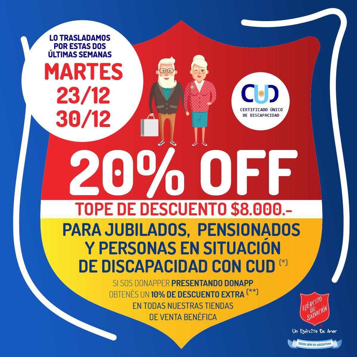 20% DE DESCUENTO para jubilados, pensionados y para personas en situación de discapacidad con CUD - Certificado Único de Discapacidad -.